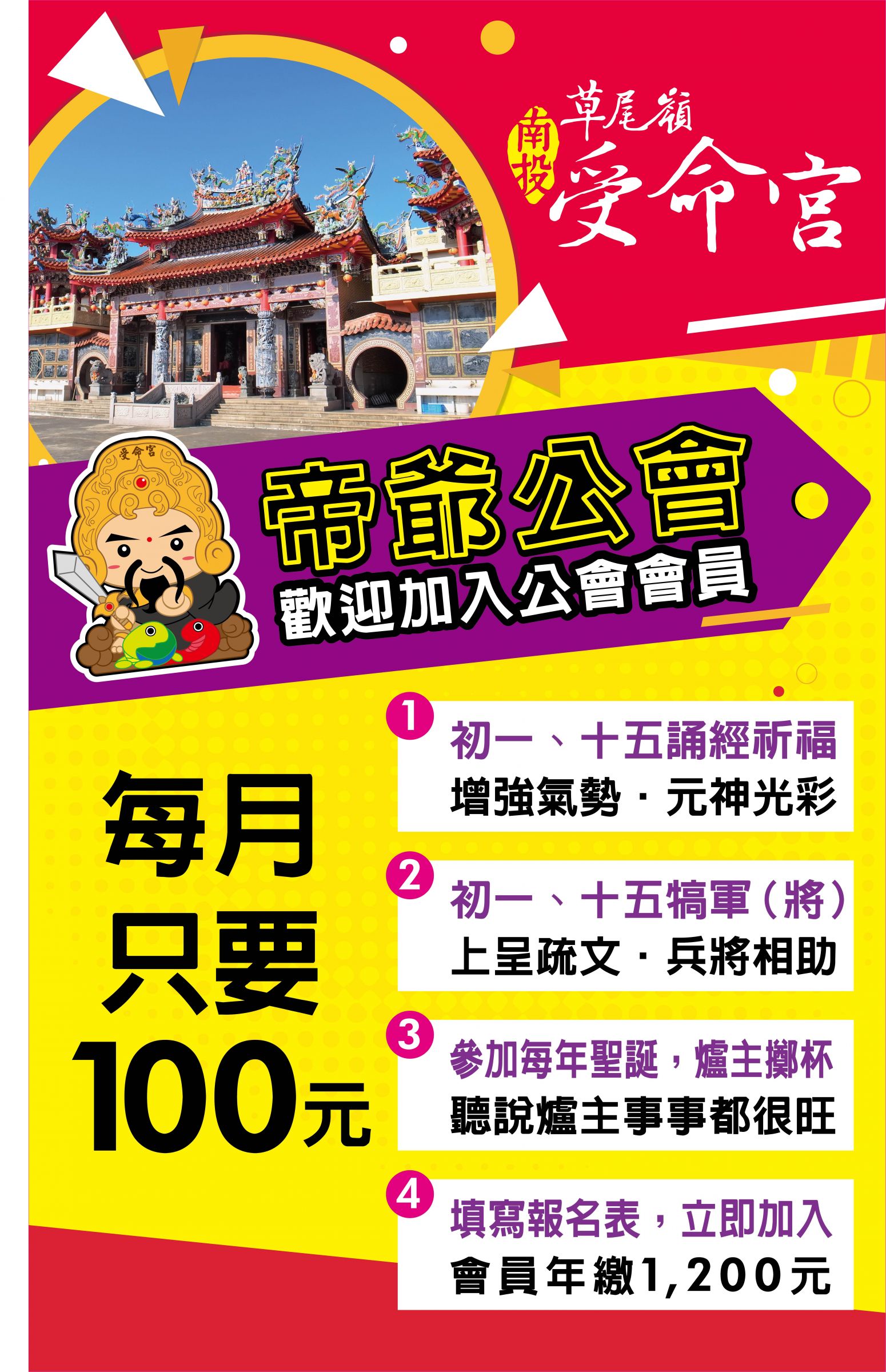 每月初一、十五犒軍及帝爺公辦理活動基金,主要以徒步回香「受天宮」活動、三月三日玄天上帝祝壽慶典及辦理年度各友宮會香活動··等,請眾善信大德共襄盛舉,幫忙推廣與贊助,讓受命宮能愈來愈好,幫助更